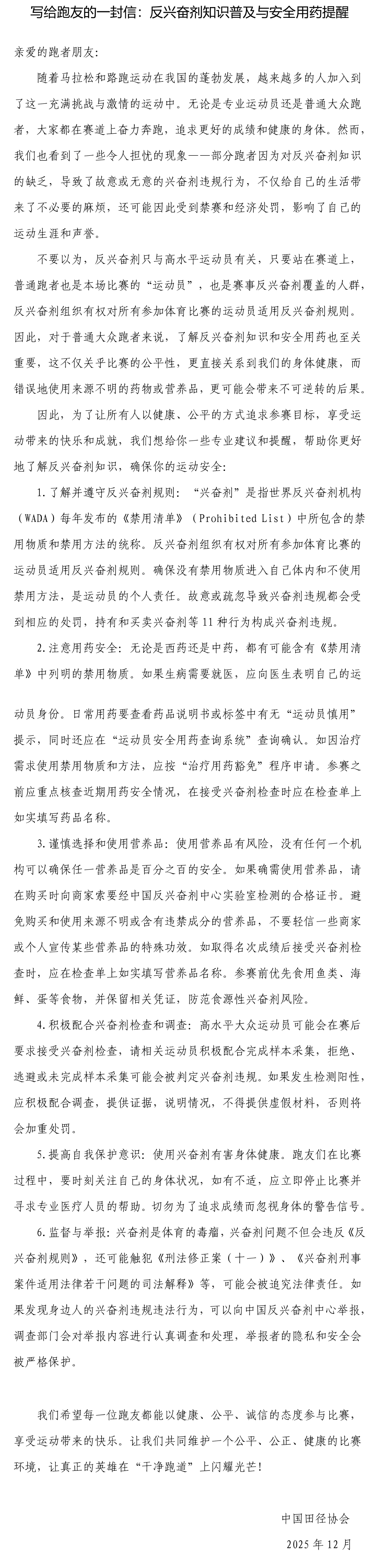 请阅读《写给跑友的一封信:反兴奋剂知识普及与安全用药提醒》