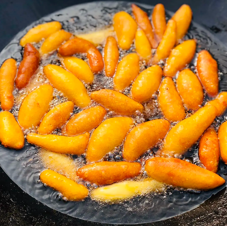 煎雀以糯米粉、番薯捏成薯浆,渗入适量的糯米粉和红糖,拌匀,搓成软硬适中的胚料,切成拇指大的小粒然后搓成椭圆形,即可入锅油炸,等到浮上油面,由金黄略转红色即成。刚出锅的煎雀香气四溢,稍微放凉后咬上一口,外酥里糯,韧而不粘,甜而不腻,满齿留香。刚炸熟的煎雀是最美味,冷了的煎雀外皮不再酥脆,但依旧软糯香甜。