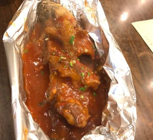端上来是用锡纸包着的,