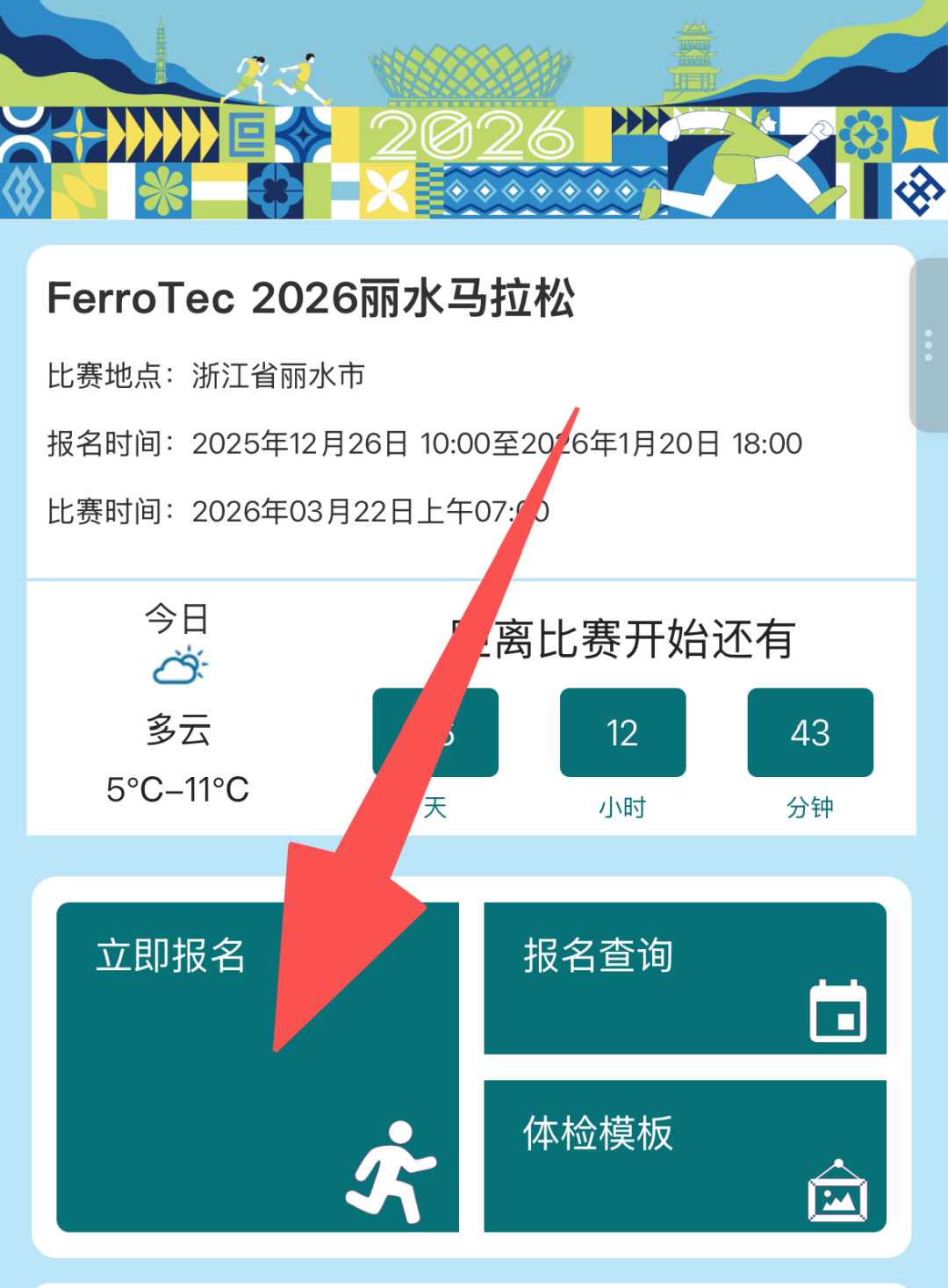 2.报名方法:通过浙江马拉松官网(www.zjim.org)或关注浙江省马拉松及路跑协会微信公众号申请,按申请先后顺序,马拉松前10名及半程马拉松前30名(须符合2026丽水马拉松参赛选手身体状况要求和规程要求,并且在浙江马拉松系列赛免费参赛资格不超过2次)免收报名费。